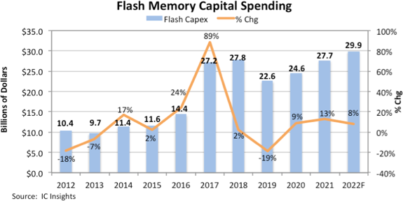 機(jī)構(gòu)預(yù)測(cè),2022年NAND閃存資本支出將增長(zhǎng)8%至299億美元,超過(guò)2018年278億美元的歷史最高記錄(如下圖)。閃存資本支出在2017年飆升,當(dāng)時(shí)該行業(yè)正向3D NAND轉(zhuǎn)型,此后每年都超過(guò)200億美元。2022年,閃存的資本支出預(yù)計(jì)將增至299億美元,因?yàn)榇笮凸?yīng)商和小型供應(yīng)商將保持適度激進(jìn)的支出水平。
